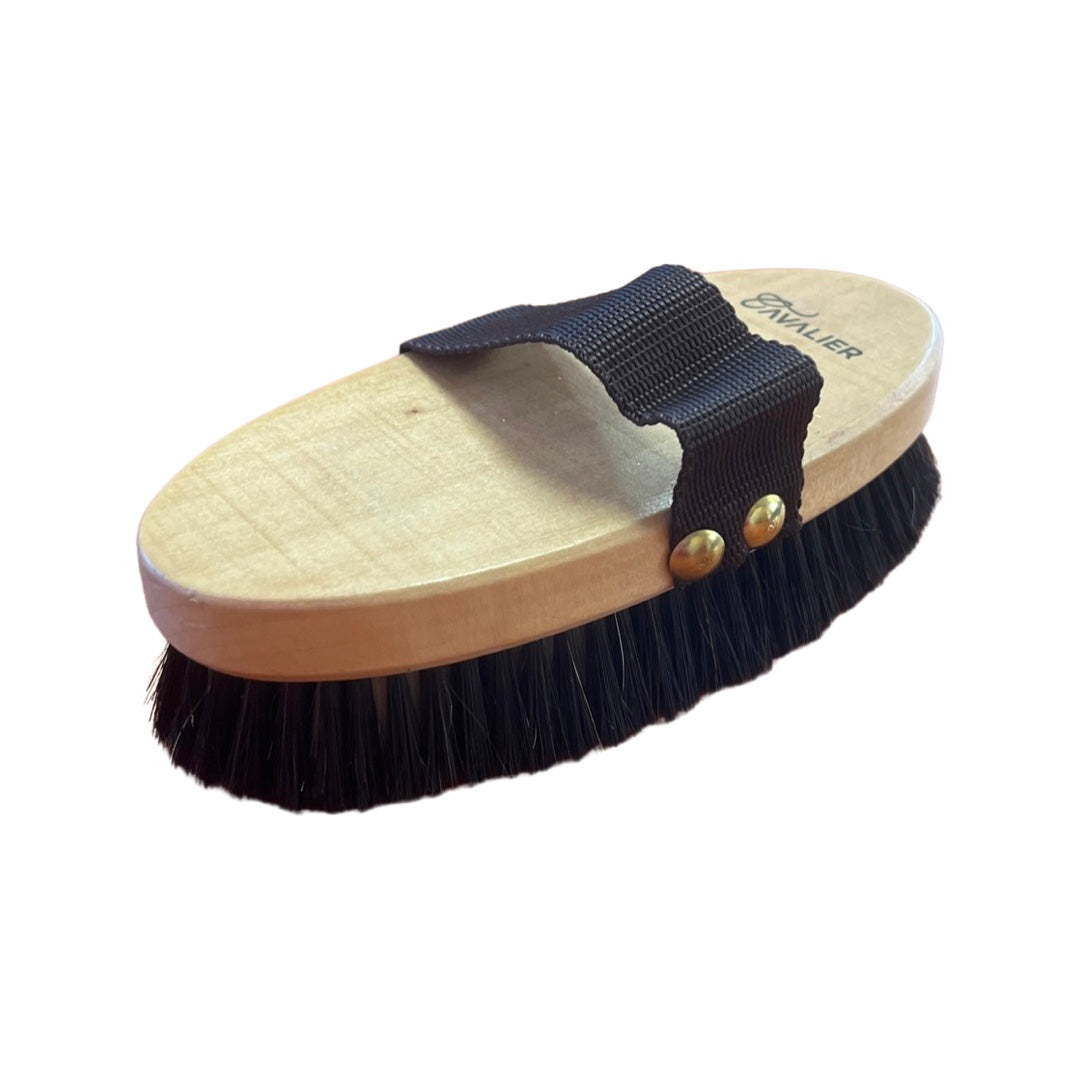 The Cavalier Natural Fibre Horse Hair Body Brush features a strap to securely hold the brush and measures 7″ x 3.5″.