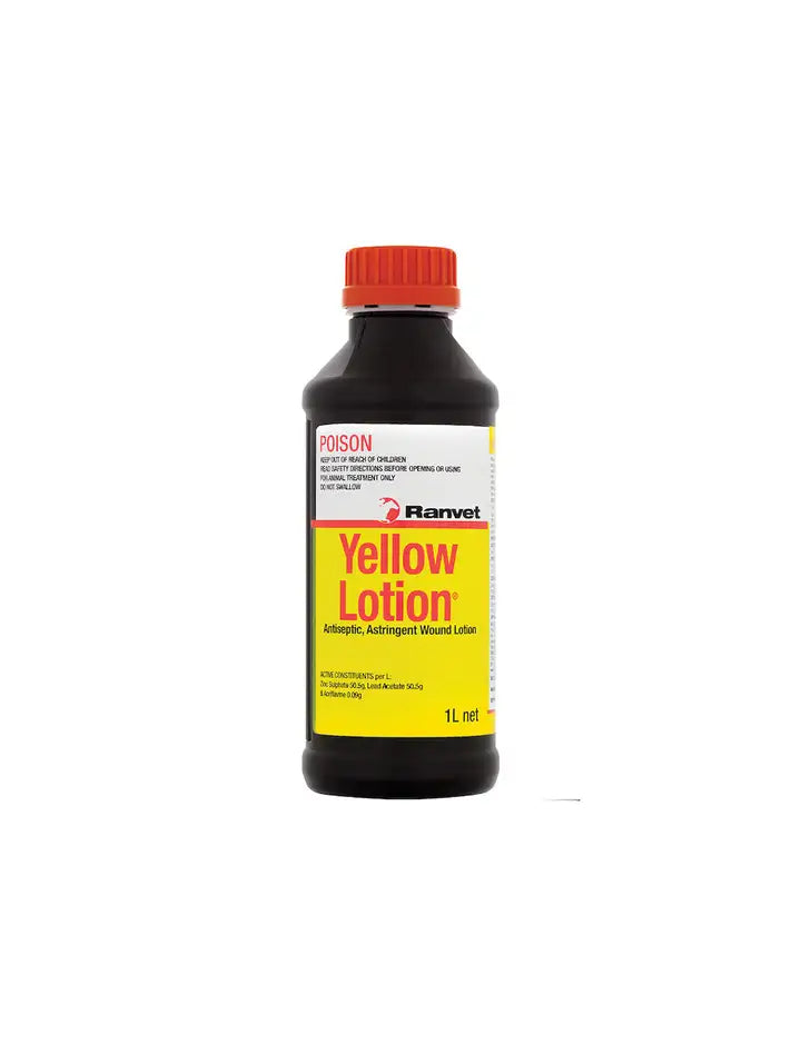Ranvet Yellow Lotion is a broad spectrum antiseptic, astringent lotion suitable for the first aid treatment of skin wounds as well as ongoing wound care. It is effective at controlling skin wound infections and also significantly reduces the formation of proud flesh. Yellow lotion contains no added pharmaceutical drugs which may contravene racing regulations.